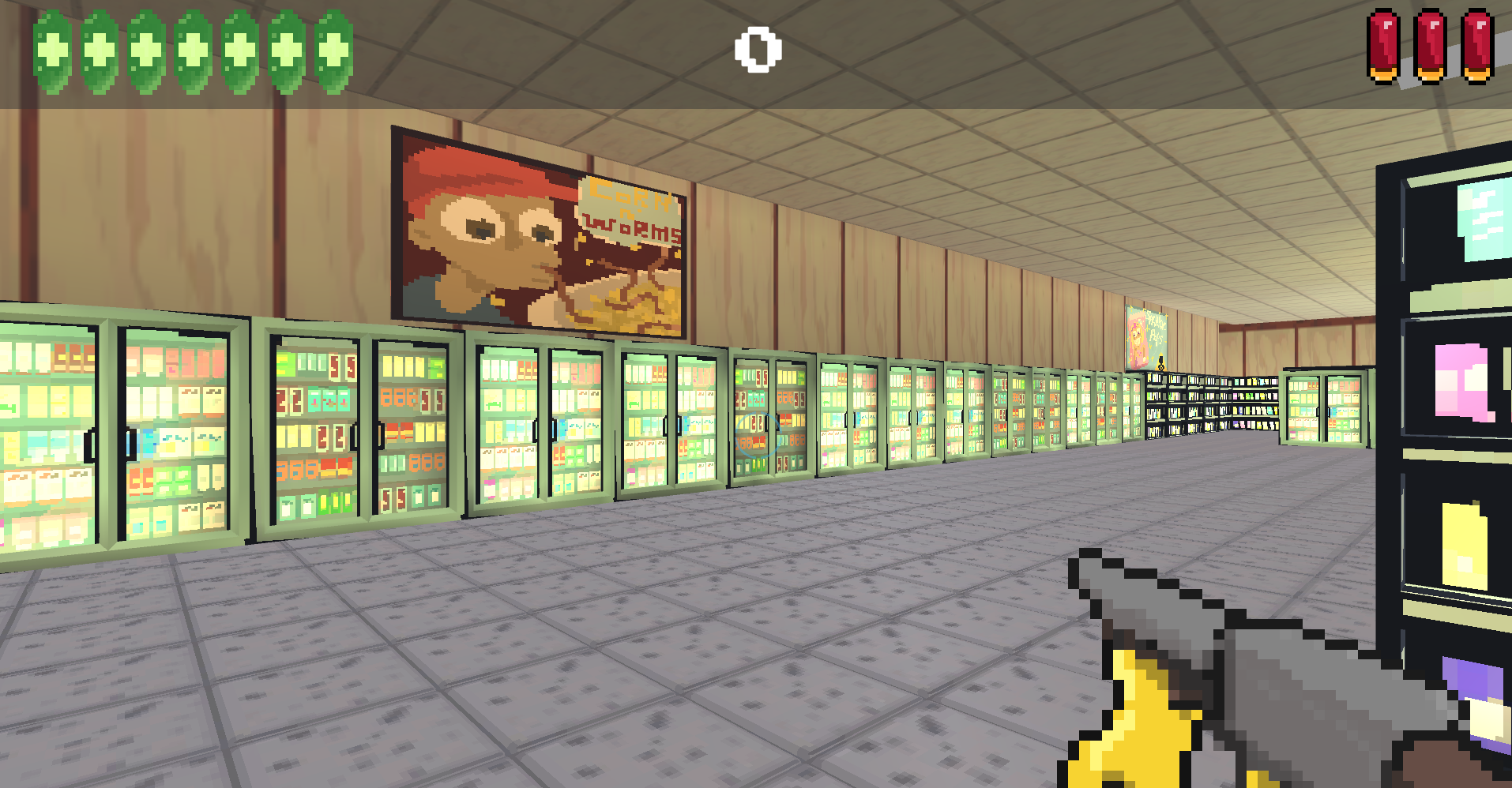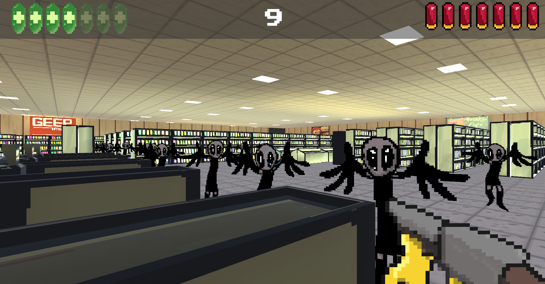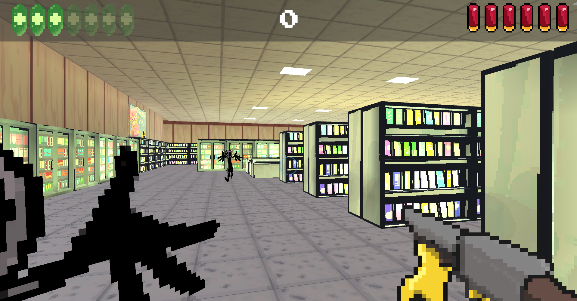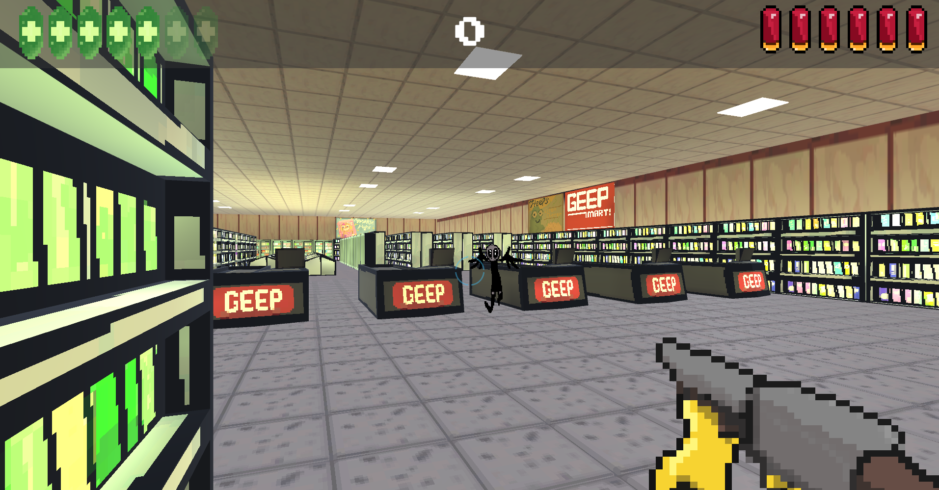 Ghost Shrimps second game: a simple shooter, made in three days durring our second private game jam in Vance’s room. Aliens have invaded the Geep mart, it seems. Good thing you brough your trusty SHOTGUN!
